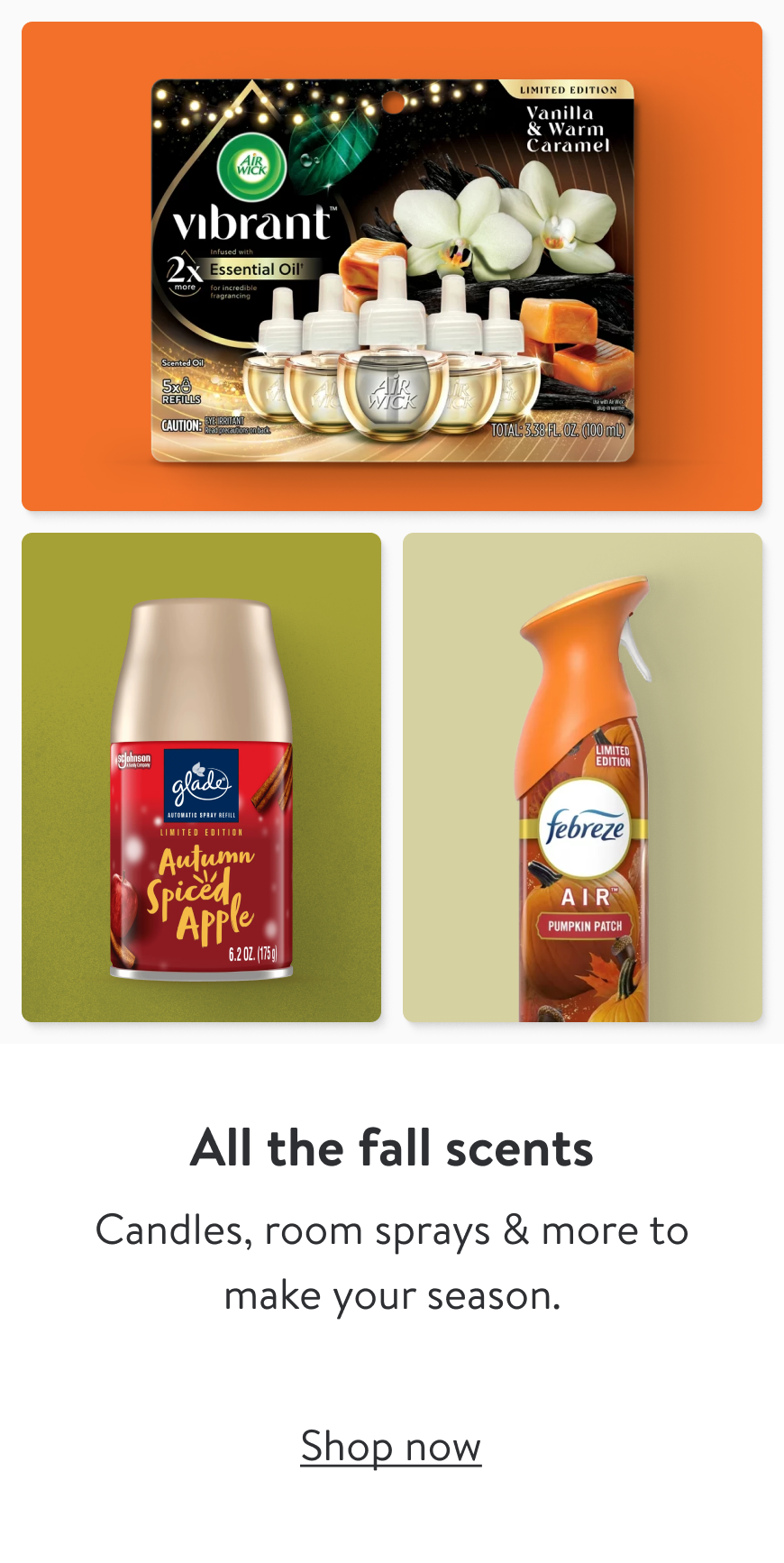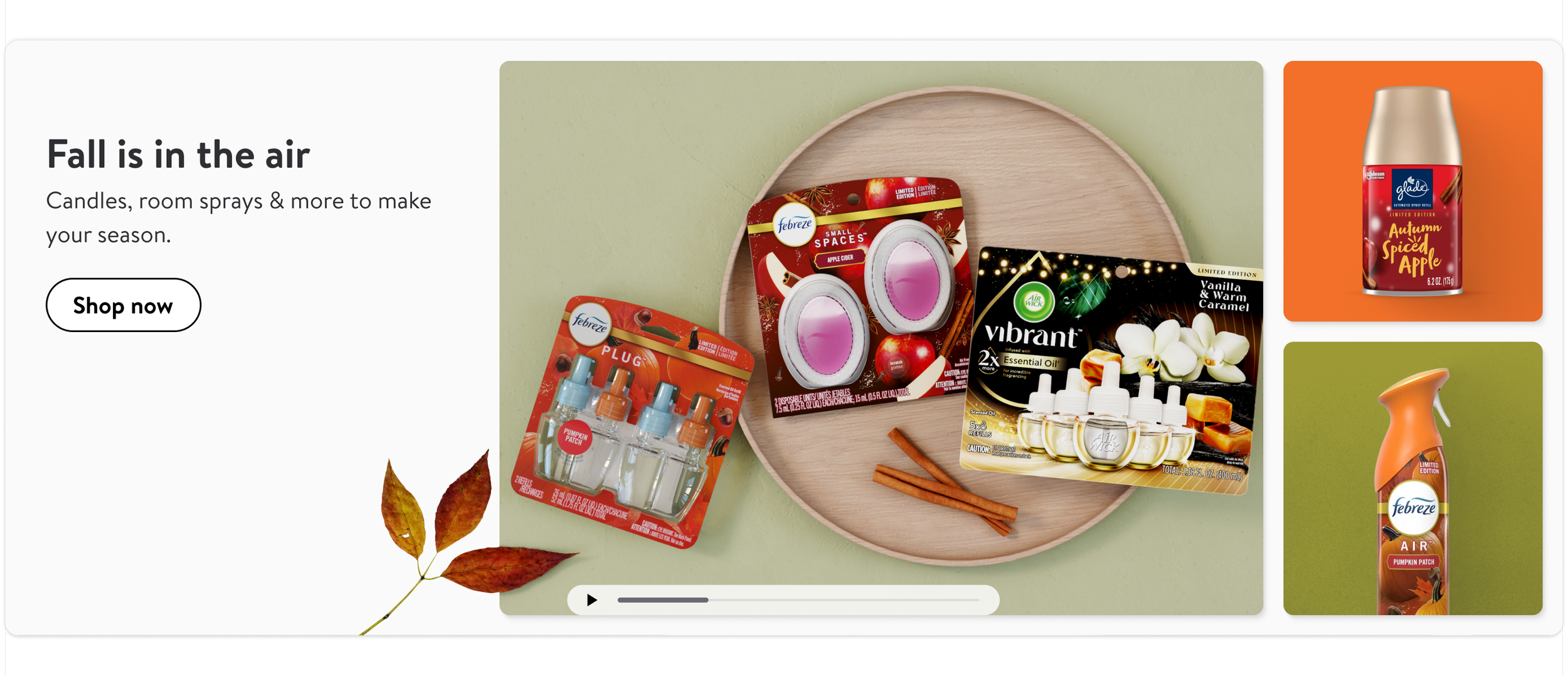 Led the creative direction for promotional visuals by conceptualizing photography in collaboration with the CGI team and overseeing the design process from start to finish. The final assets showcased top fall scents and were featured prominently on the Household Essentials category page and across the site, driving traffic to the Air Care category.